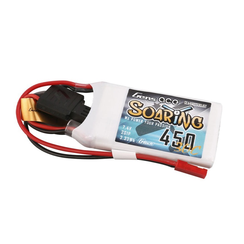 Gens Ace Li-Po G-Tech 2S 7.4V 450mAh 30C Soaring with BEC GT2S0450-30BProduct DetailsGens Ace Soaring 450mAh 7.4V 30C 2S1P LiPo Battery is a great fit for all smaller Helins and Planes like the Blade 130X and Indoor Foam Planes, he delivers consistent Powe