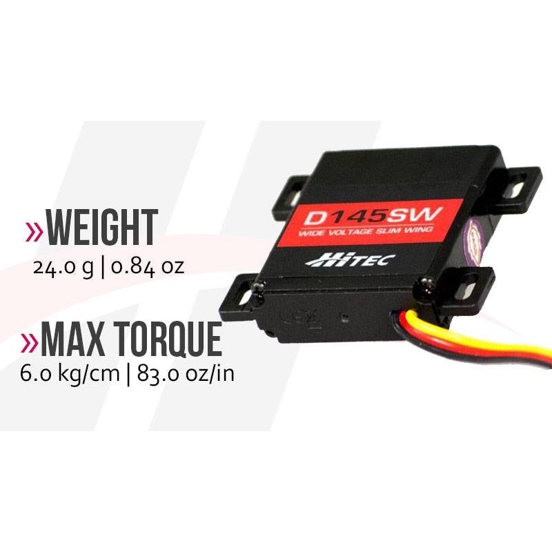 Hitec D145SW Slim Wing Digital Cored Servo 24g 6kg/0.14s 4.8V - 7.4V 2221260With 32-bit high resolution, ultra-response technology and wide voltage operation, the slim wing D145SW has heavy-duty, steel gears, providing instant torque and holding power for