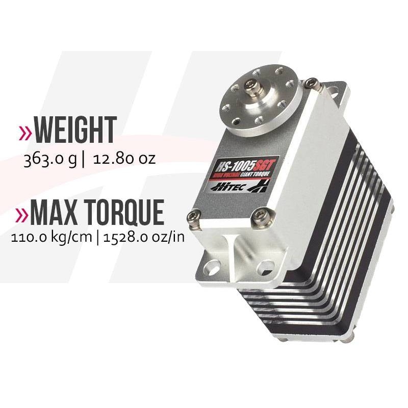 Hitec HS-1005SGT Ultra Giant Digital Cored Servo 363g 110kg/0.19s 11.1V - 14.8V 2222355The ultra heavy duty, giant scale HS-1005SGT delivers digital precision and high voltage punch to your most demanding projects. Designed with an all-aluminium, EMI-shiel