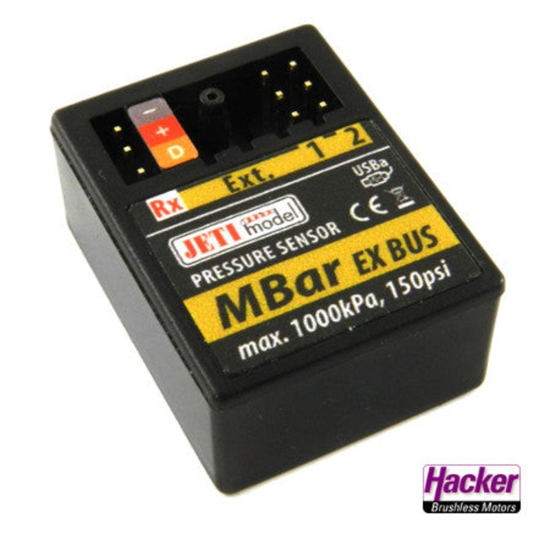 Jeti Duplex 2.4EX MBar JEX-MB 80001321Duplex MBar Air Pressure SensorThe Mbar high pressure sensor (Up to 150 psi/ 10 bar). No more damaged airplanes, creating logical condition in your Jeti Radio and using this sensor you can simply set up air retract fai