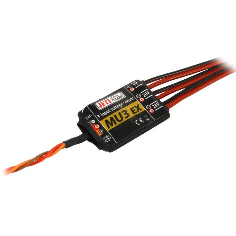 Jeti Duplex 2.4EX MU 3 JEX-MU3The sensor MU-3 can be used for model on board monitoring of up to three voltages. With the aid of the MU-3 sensor the historical course of particular voltages can be monitored (minimum andmaximum values) and the sensor may wa