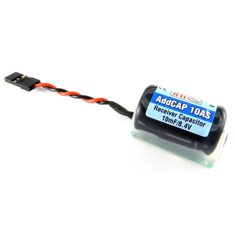 JETI Model Add cap 10AS Receiver Capacitor (J-AC-10AS)Incorporates logic for managing the initial gradual charging of the system capacitors.Very high capacity: 10mF = 10000FThe AddCAP design makes it suitable for use in configurations where the receiver is