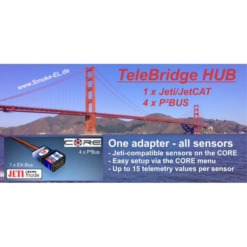 Jeti to Powerbox Core Telemetry Bridge HUB Z0502 from Smoke SystemsThe Telemetry-Bridge HUB / PBS Dock 6624 Version connects Jeti-compatible sensors to the telemetry bus (P-Bus) of the PowerBox CORE.The TeleBridge HUB is a four-way distributor for the PBUS