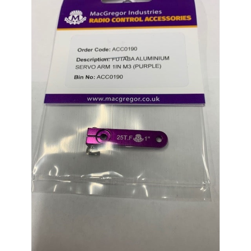 MacGregor Futaba Aluminium Servo Arm 1.0in M3 Purple ACC01901.0in (M3) Aluminium Servo Arm for 25T Spline Servos such as Futaba and MacGregor.Colour: Purple (Anodised)