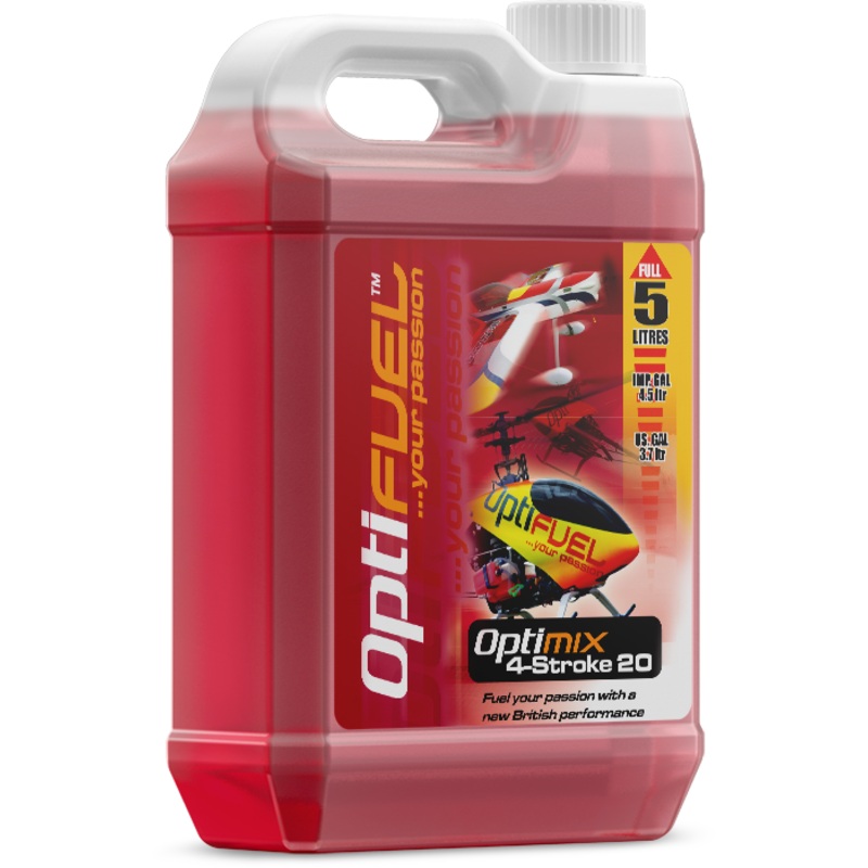 Optifuel Optimix 20 4-Stroke Nitro Glow Fuel 5L OH2020SLKDesigned for 4-Stroke aircraft engines and Helicopter flyers who prefer a higher Oil content. 20% Nitromethane and 20% Synthetic Oil. Supplied in 5L containers not US Gallon (3.78L).