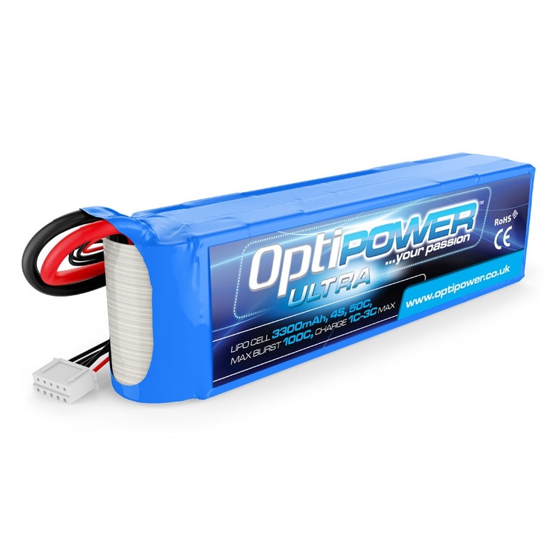 Optipower LiPo Battery 3300mAh 4S 50C OPR33004S503300mah 4S pack rated at 50C continuous, with a burst of 100C12AWG Silicon wires and JST-XH balance connector136mm x 42mm x 28mmWeight 386g +/-5g