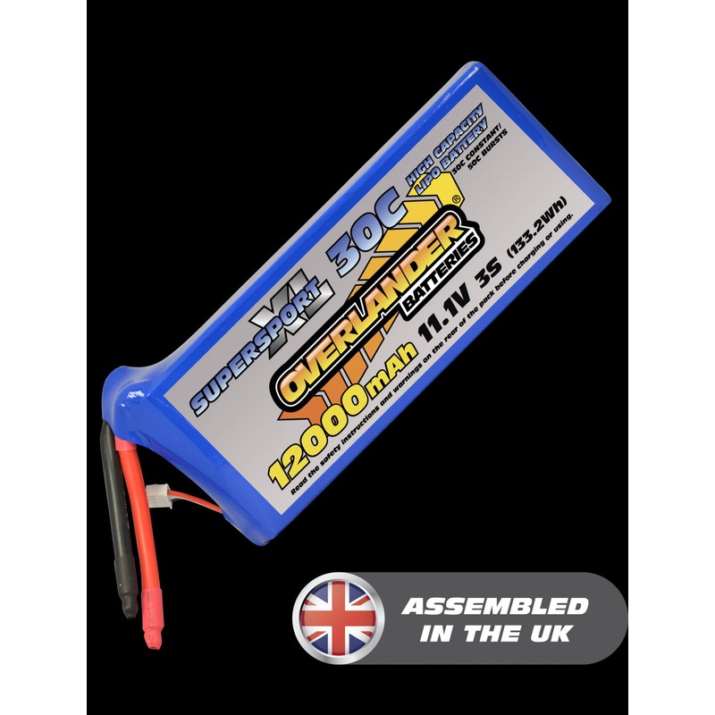 Overlander 12000mAh 11.1V 3S 30C Supersport XL LiPo Battery 3155The Overlander 12000mAh 11.1V 3S 30C Supersport XL LiPo Battery delivers exceptional power and extended run times for large-scale RC models and UAVs. With a substantial 12000mAh capacity and 1