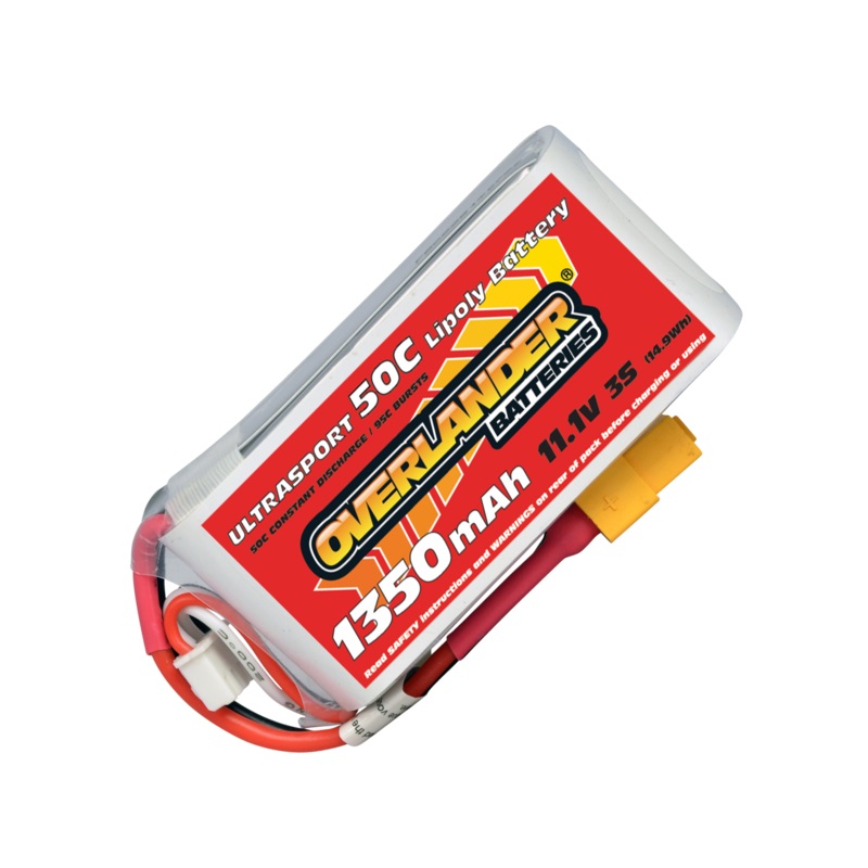 OVERLANDER 1350MAH 11.1V 3S 50C ULTRASPORT LIPO BATTERYThe Overlander 1350mAh 11.1V 3S 50C Ultrasport LiPo Battery is engineered for RC enthusiasts who demand powerful performance in a compact size. This battery packs a robust 1350mAh capacity and a high 5