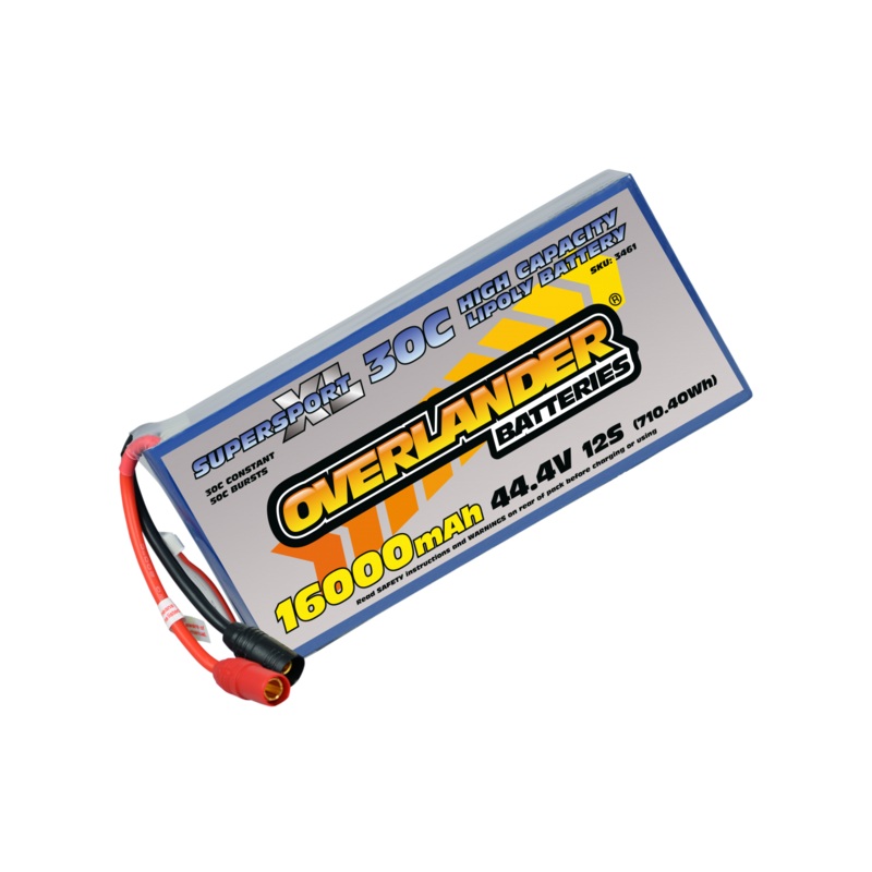 Overlander 16000mAh 44.4V 12S 30C Supersport XL LiPo Battery - XT90 Anti Spark Connector 3461The 16000mAh 44.4V 12S 30C LiPo battery is part of Overlander's advanced Supersport XL range. This is our highest-capacity range, specially designed for use within