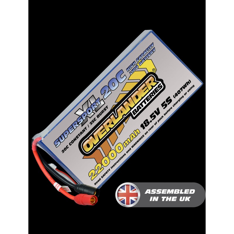 Overlander 22000mAh 18.5V 5S 20C Supersport XL Lipo Battery - XT90 Anti Spark Connector 3239The 22000mAh 18.5V 5S 20C LiPo battery is part of Overlander's advancedSupersport XL range.This is our highest-capacity range, speciallydesigned for use within larg