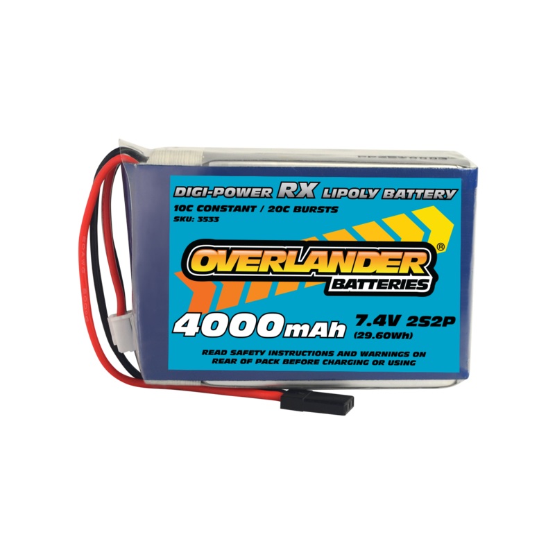 Overlander 4000mAh 7.4v 2S Digi-Power Receiver Pack LiPo Battery 3533The 4000mAh 7.4V2S2P LiPo battery is part of Overlander's Digi-Powerrange. These LiPo packs are the perfect alternative to your NiMH receivers. They are ready-fitted withJR Universal conn